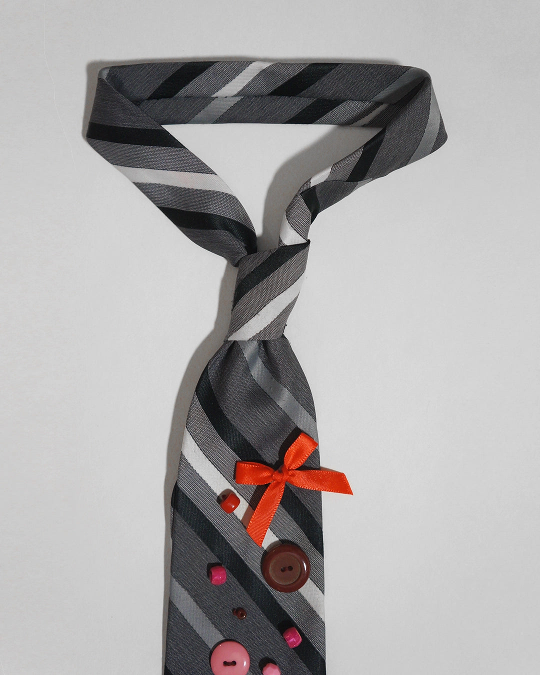 Vintage tie adorned with buttons, a Turning Tides embroidered patch, bows, and charms.